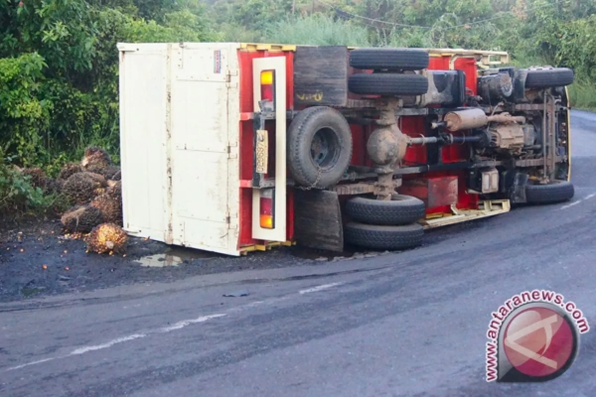 Sebuah truk terguling di jalan lintas Sumatera, Negeribaru, Waykanan, Lampung. (Foto ANTARA/Gatot Arifianto)