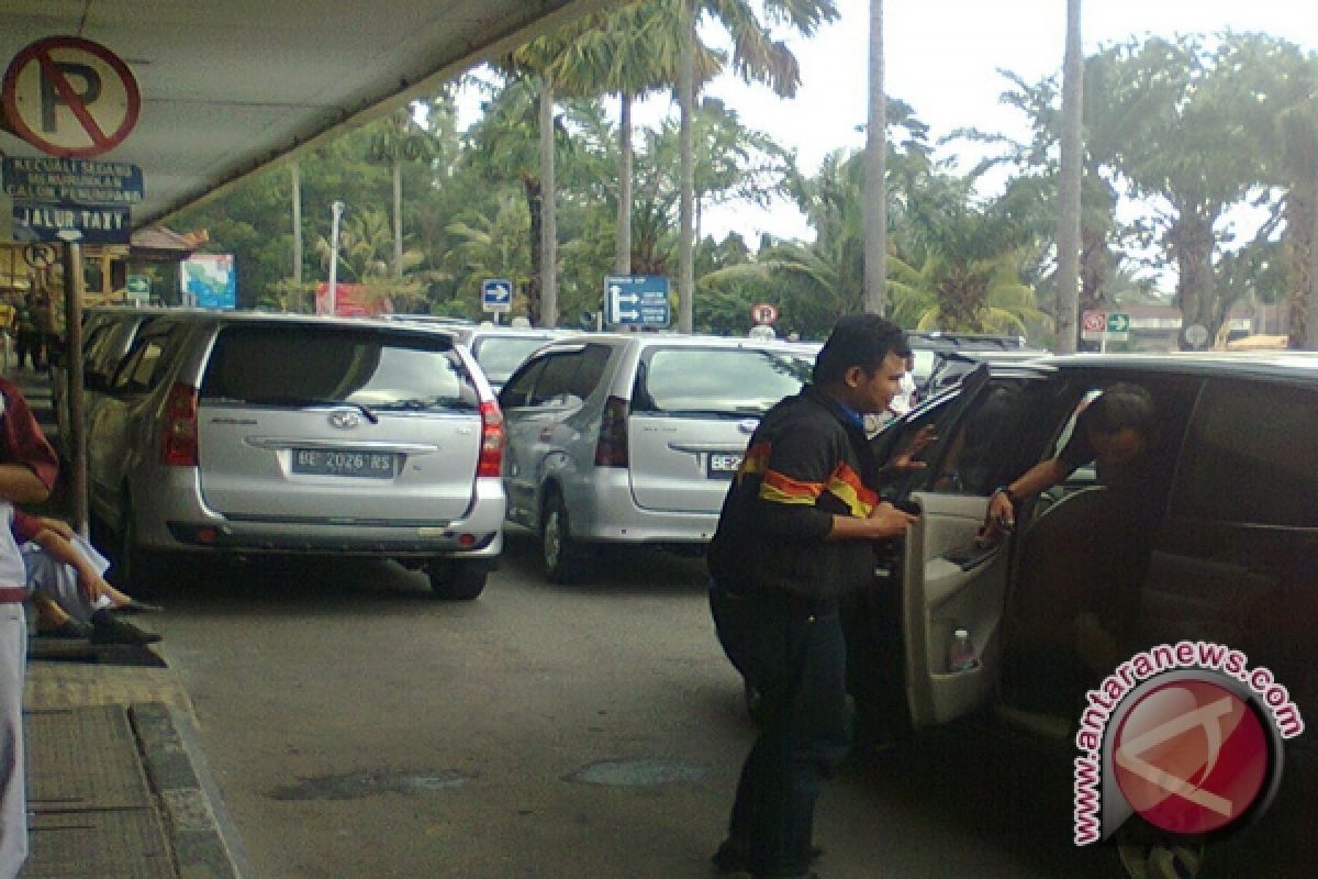 Puluhab taksi berpelat hitam bebas parkir di jalan lintas Bandara Raden Inten II Lampung, meski terdapat tanda larangan parkir. (FOTO ANTARA LAMPUNG/Hisar Sitanggang)