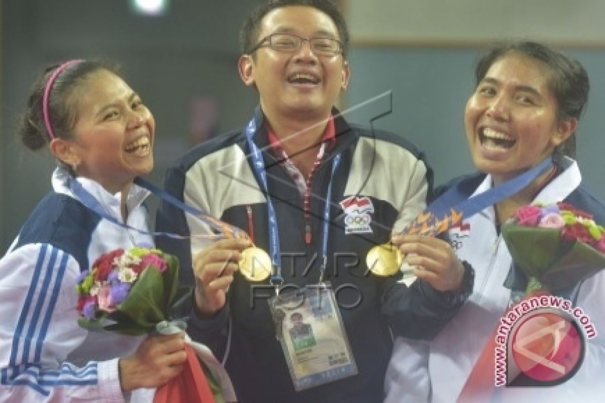 Ganda putri Indonesia Nitya Krishinda (kanan) dan Gresya Polii (kiri) bergembira bersama pelatih mereka Eng Hian (tengah) usai penghargaan medali final perorangan Ganda Putri Asian Games ke-17 di Gyeyang Gymnasium, Incheon, Korsel, Sabtu (ANTARA FOTO