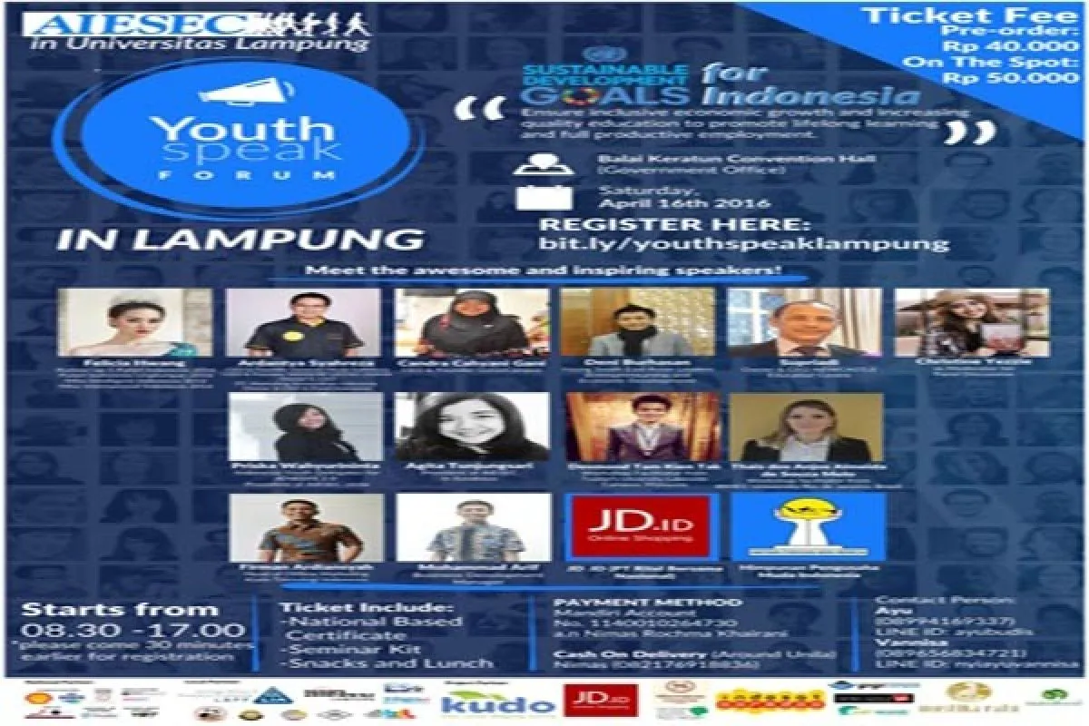 "Lampung Youth Speak Forum 2016 merupakan projek nasional yang dilaksanakan oleh AIESEC Universitas Lampung. Acara ini bukan hanya seminar biasa melainkan bentuk kegiatan dukungan para pemuda terhadap Sustainable Development Goals atau SDGs Perserikatan Banga Bangsa yang bertujuan menjadikan dunia khususnya Indonesia menjadi negara yang lebih baik pada tahun 2030," ujar Presiden AIESEC Universitas Lampung (Unila) Priska Wahyurininta, di Bandarlampung, Jumat (15/4).