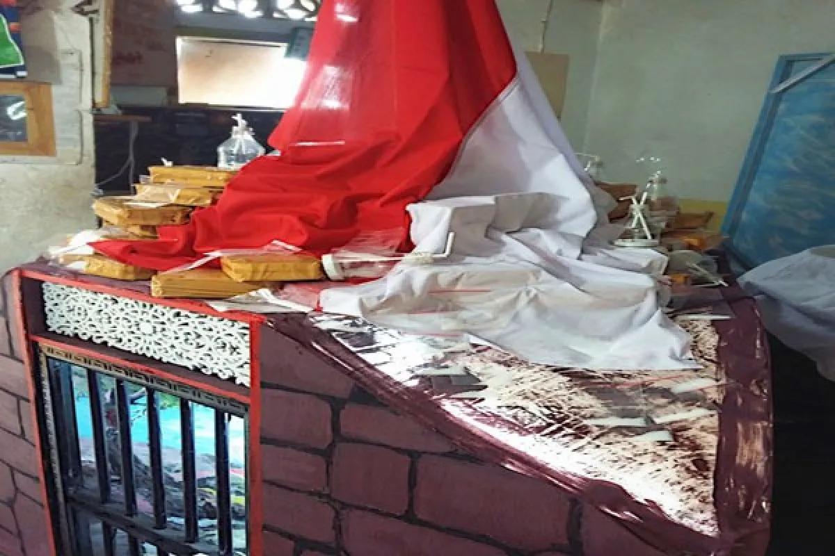 Karya berupa visual bangunan penjara di atasnya ada tumpukan ganja, ekstasi, sabu-sabu, dan bong yang hampir menutupi bendera Merah Putih.