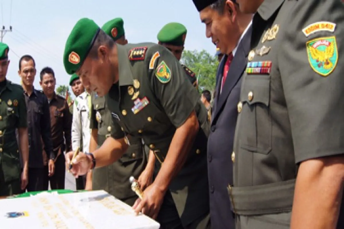 Danrem 043/Garuda Hitam, Provinsi Lampung Kolonel Inf Joni Supriyanto di Kelurahan/Kecamatan Blambanganumpu, Kabupaten Waykanan, Lampung, Kamis (13/10), menandatangani batu prasasti peresmian Kodim 0427. Keberadaan Kodim tersebut diharapkan bisa mena