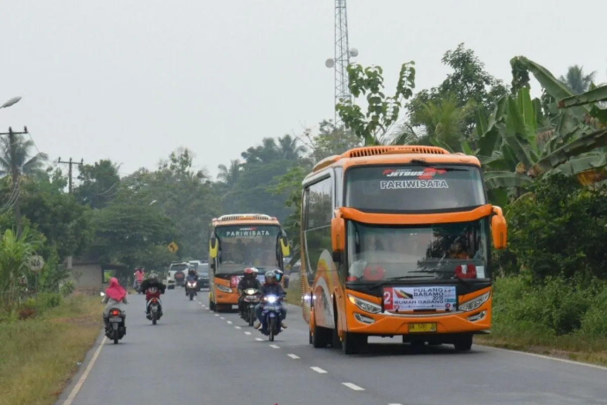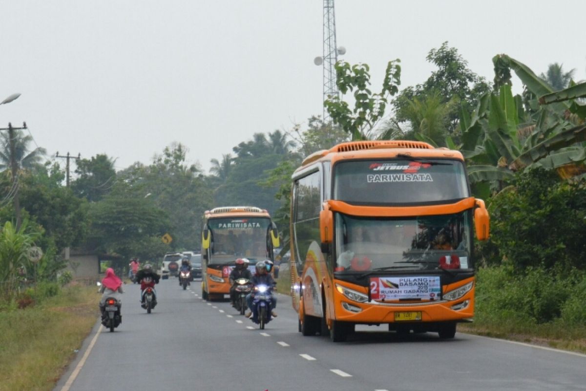 Kendaraan pemudik melaju dengan kecepatan sedang di jalur Jalan Lintas Timur Sumatera yang kondisi jalanya secara umum cukup baik.