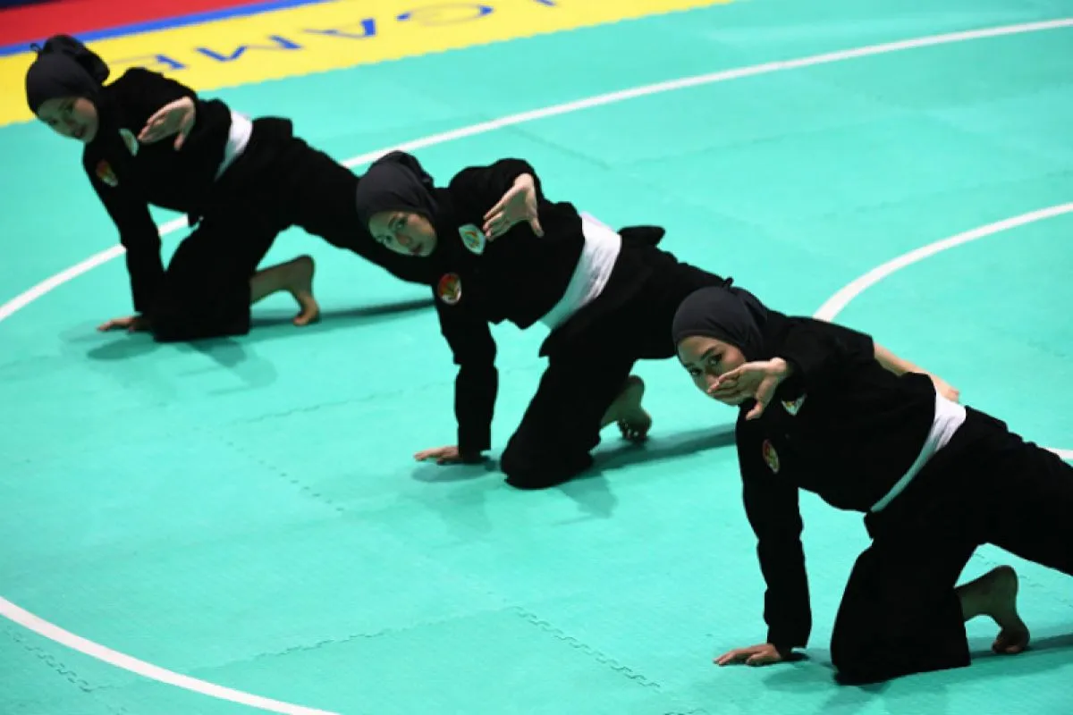 Jakarta (Antaranews Lampung) - Cabang olahraga Pencak Silat kembali menyumbang medali emas kesebelas setelah pesilat beregu putri Indonesia, Pramudya Yuristya/Lutfi Nurhasanah/Gina Tri Lestari berhasil meraih poin tertinggi di babak final ajang Asian Games 2018, di Padepokan Pencak Silat Taman Mini Indonesia Indah (TMII), Jakarta Timur, Rabu.