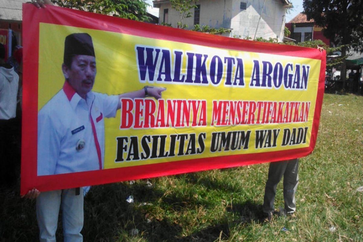 Dalam aksi demo itu warga Waydadi membentangkan spanduk-spanduk penolakan dan harapan kepada pemerintah terkait.