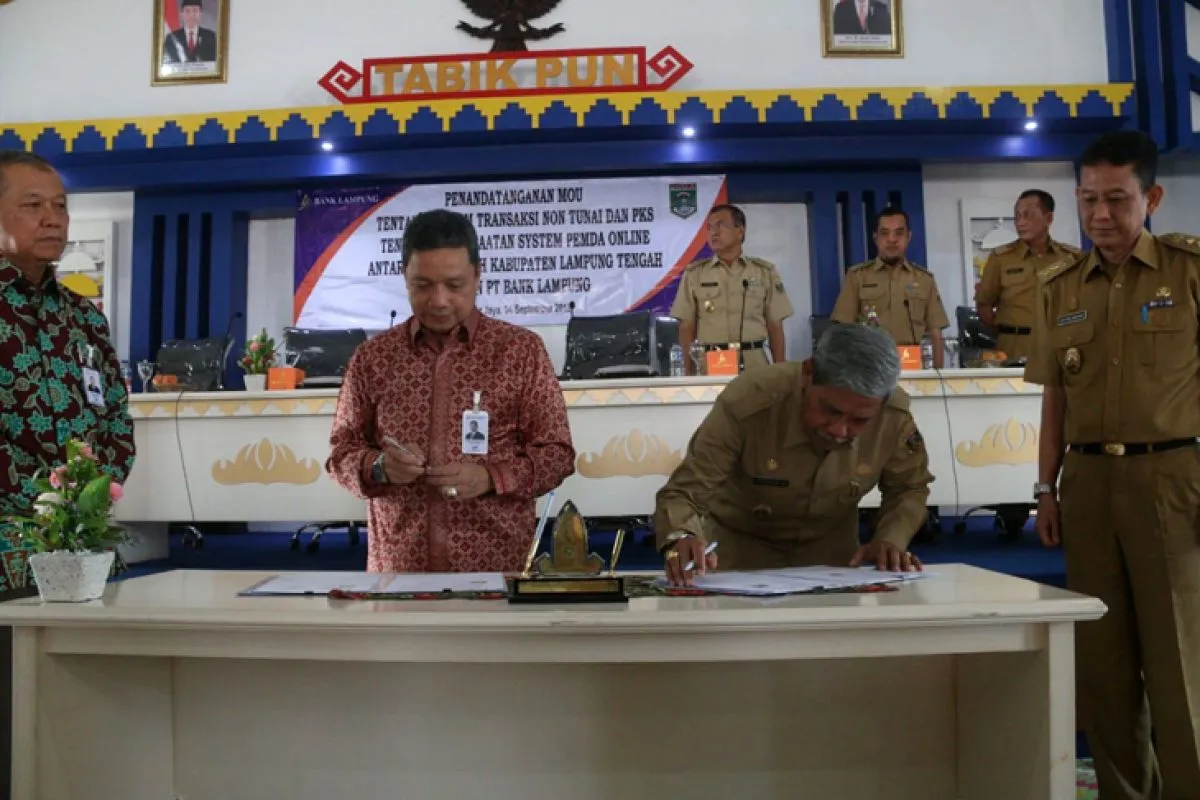 Penandatanganan kerja sama (MoU) antara Pemerintah Kabupaten Lampung Tengah dengan PT. Bank Lampung tersebut dilaksanakan di Aula Pemkab lampung Tengah, Selasa (4/9)