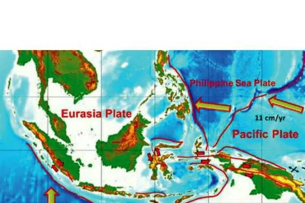 Gambar di atas menunjukkan arah pergerakan setiap lempeng tersebut. Lempeng Samudra Hindia-Australia bergerak ke arah utara dan bertumbukan dengan Lempeng Eurasia. Lempeng Pasifik bergerak ke arah barat sedangkan Lempeng Eurasia relatif diam.