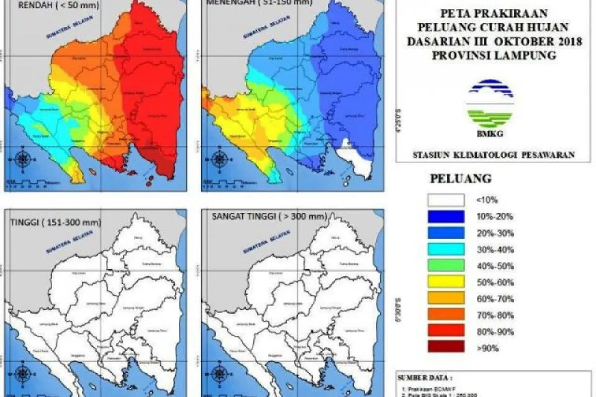 Kemudian, informasi Prakiraan Peluang Curah Hujan Dasarian III Oktober 2018, secara umum Provinsi Lampung berpeluang hujan dengan kategori rendah (< 50 mm/das) dengan peluang (30-40 persen) terjadi pada Kabupaten Pesisir Barat, Lampung Barat, dan sebagian Tanggamus.