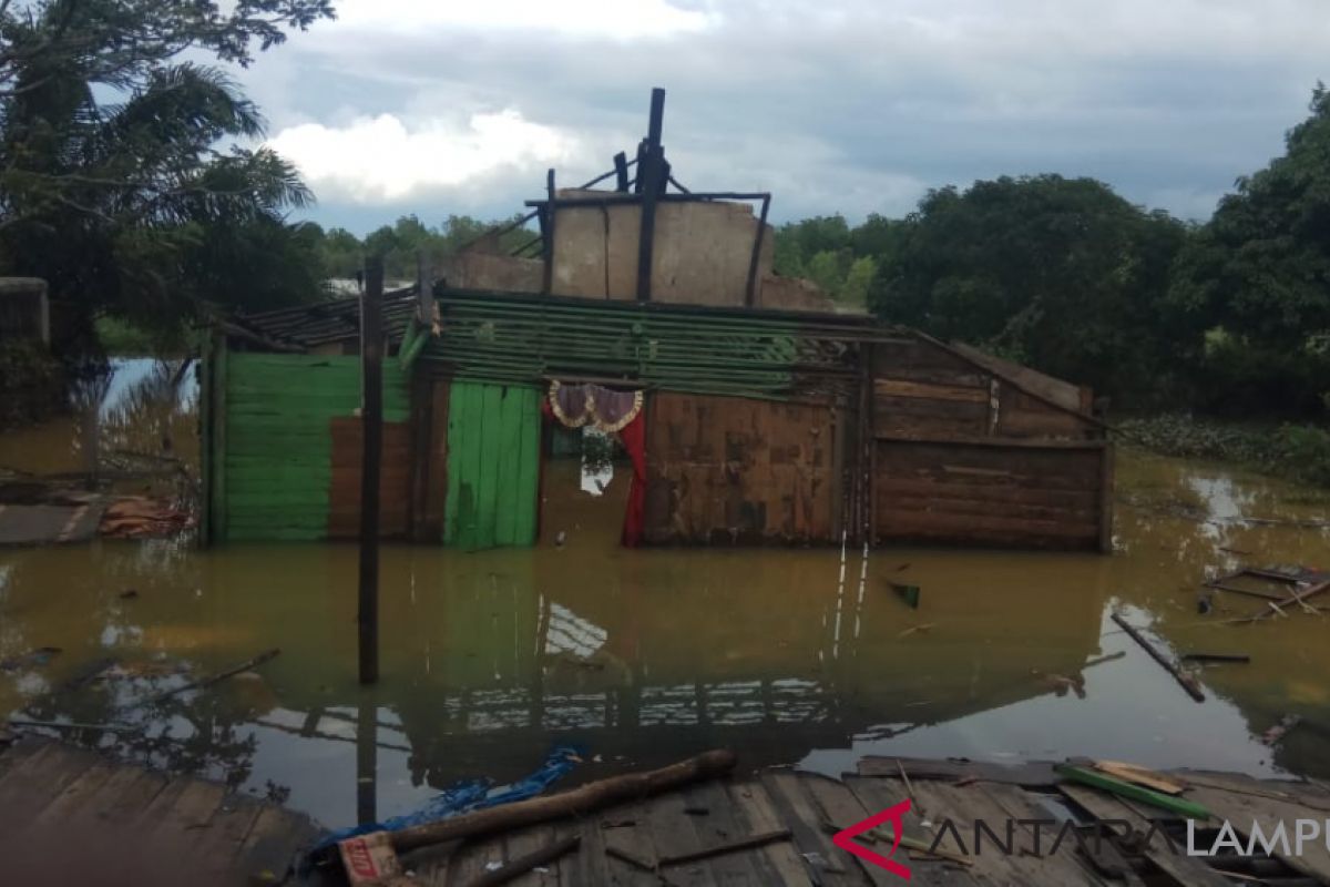 Plt Bupati Mesuji bersama Kepala Dinas Sosial setempat, Suhaimi, mendatangi warga yang rumahnya roboh akibat banjir, di Desa Labuhan Permai Kecamatan Way Serdang, Mesuji, Sabtu.