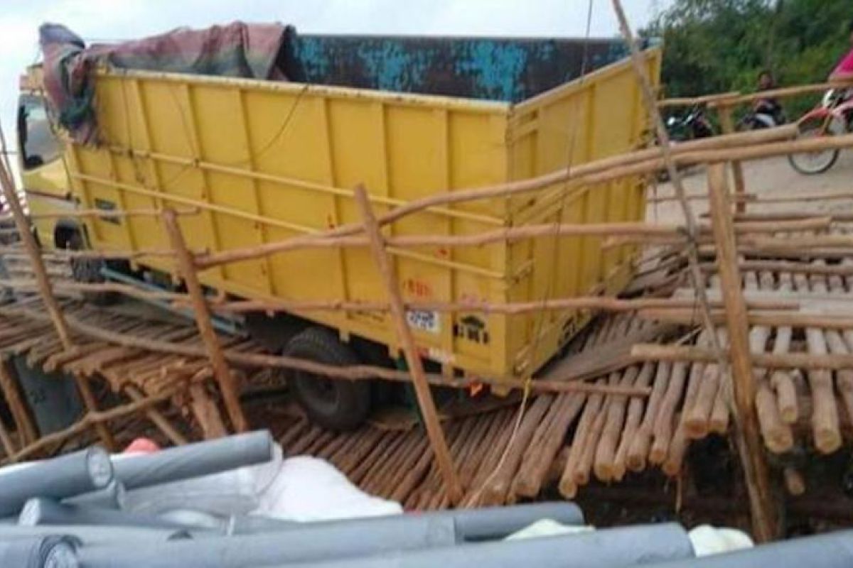 Satu unit truk bermuatan nekat melintasi jembatan darurat yang hanya terbuat dari kayu. Truk ini diketahui dari arah Lampung menuju ke Sumsel.