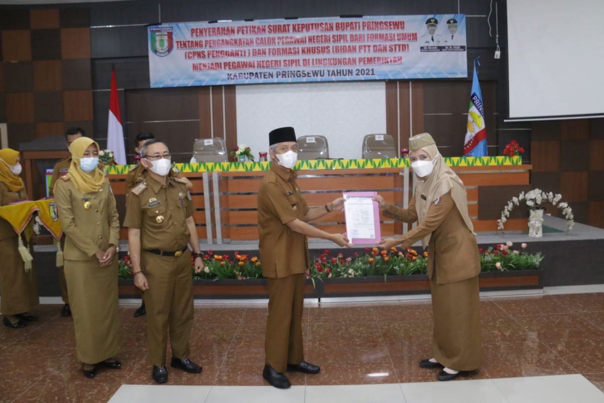 Bandarlampung (ANTARA) - Bupati Pringsewu, Sujadi menyerahkan SK PNS kepada 17 calon Pegawai Negeri Sipil Daerah (CPNSD) Kabupaten Pringsewu .
