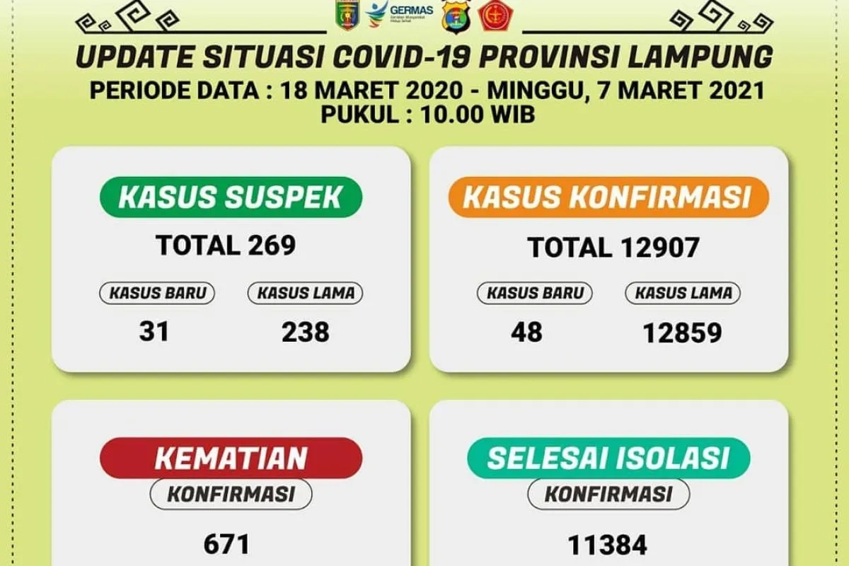 Bandarlampung (ANTARA) - Dinas Kesehatan (Dinkes) Provinsi Lampung mencatat kasus harian COVID-19 di provinsi ini bertambah 48 pasien baru, sehingga total jumlah orang yang telah terinfeksi Virus Corona baru ini hingga kini berjumlah 12.907 orang.