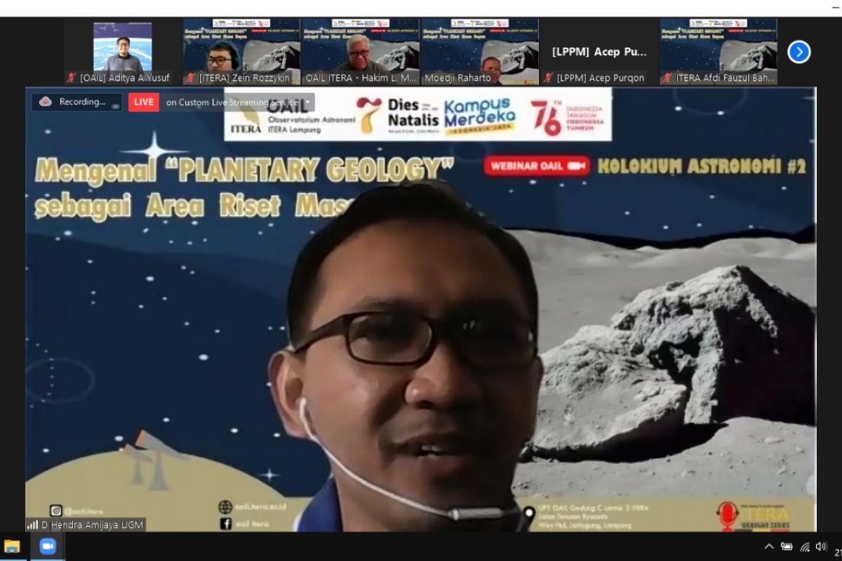 Kolokium yang diadakan secara daring tersebut menghadirkan narasumber utama dosen teknik geologi, Universitas Gajah Mada, yang juga Ketua Tim Pembina Olimpiade Sains Kebumian Pusat Prestasi Nasional dan Pembina Astrogeology Club, Dr. Hendra Amijaya. Kolokium yang membahas planetary geology sebagai area riset masa depan tersebut dipandu oleh moderator dosen Sains Atmosfer dan Keplanetan Itera, Achmad Zainur Rozzykin.