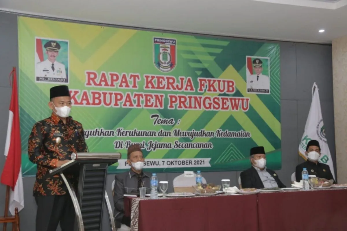 FKUB adalah forum yang dibentuk oleh masyarakat dalam rangka membangun, memelihara dan memberdayakan umat beragama untuk kerukunan dan kesejahteraan masyarakat khususnya Kabupaten Pringsewu. Oleh karena itu, semoga melalui rapat kerja ini akan dapat merumuskan berbagai program dan langkah-langkah yang lebih baik demi mempertahankan keutuhan dan persaudaraan dalam suasana kehidupan yang harmonis dan penuh perdamaian di tengah berbagai keberagaman yang ada.