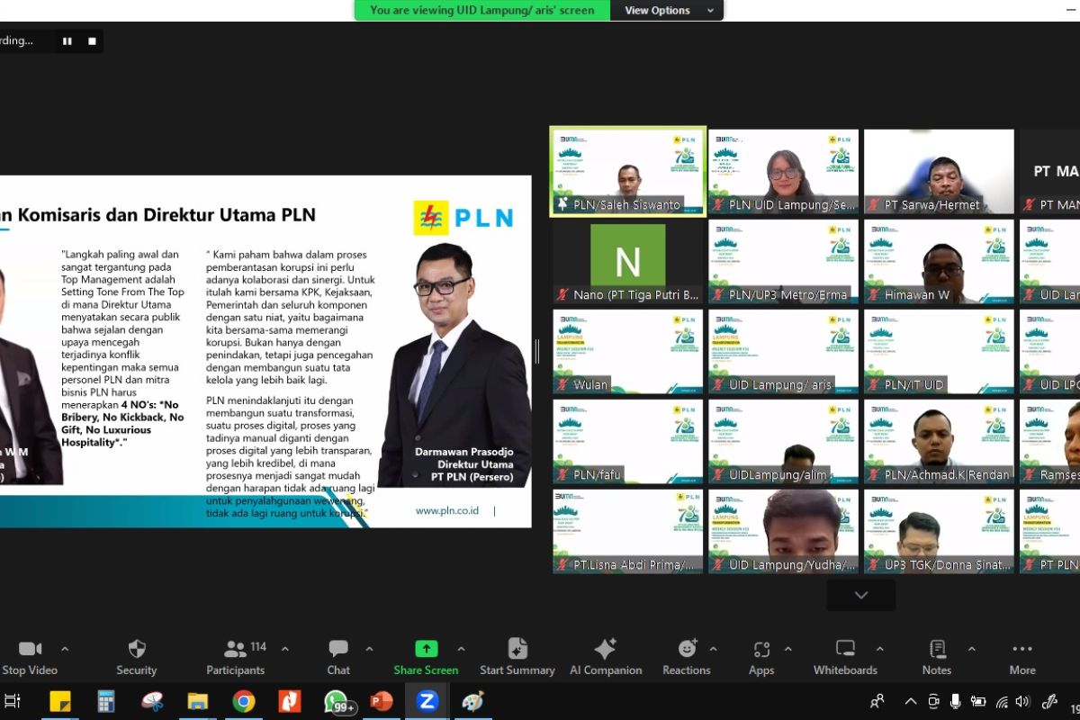 PT PLN (Persero) Unit Induk Distribusi Lampung menggelar Sosialisasi Sistem Manajemen Anti Penyuapan (SMAP) kepada seluruh Mitra Kerja dan Vendor dalam acara Collective Action (CA) yang dilaksanakan secara daring pada Kamis (19/10).