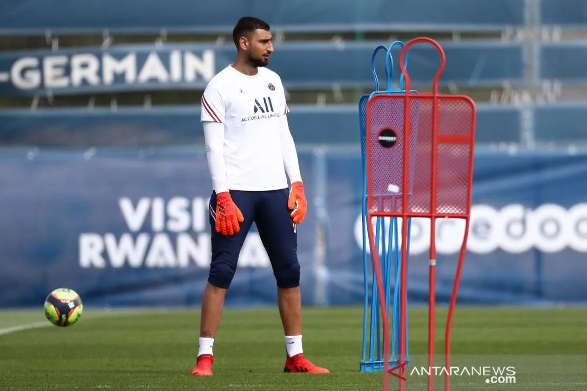 Kiper Paris St Germain Gianluigi Donnarumma berlatih di Ooredoo Training Centre, Saint-German-en-Laye, Prancis, Sabtu (28/8/2021). ANTARA FOTO/REUTERS/Sarah Meyssonnier/AWW/djo
