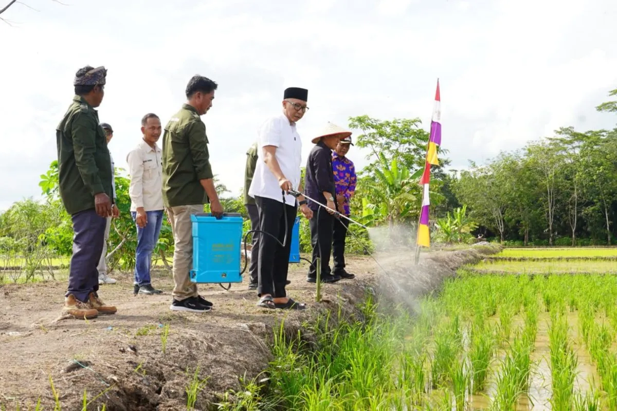 Gubernur Lampung Rahmat Mirzani Djausal saat mengaplikasikan pupuk organik cair buatan masyarakat desa di provinsi tersebut. ANTARA/HO-Pemprov Lampung.