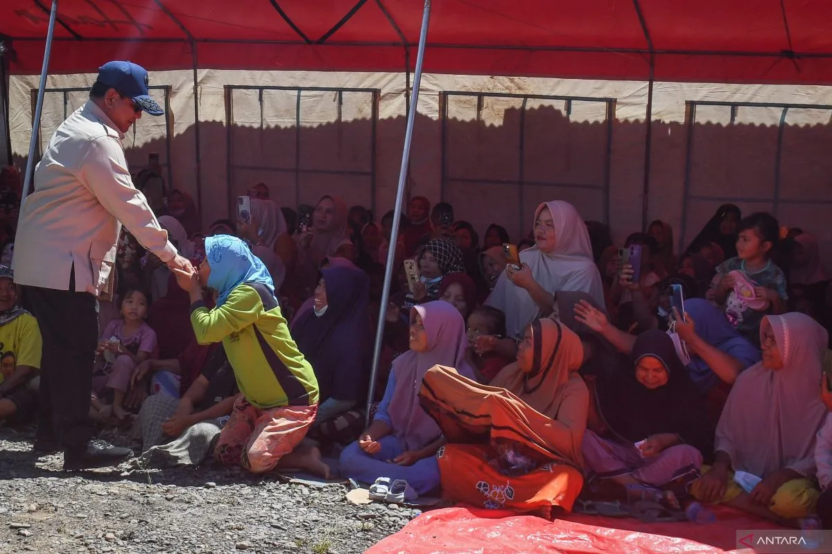 Sebelum mengakhiri kunjungan, presiden Prabowo mengapresiasi keteguhan warga yang tetap bersemangat meski dilanda musibah.