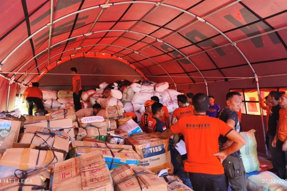 Barang-barang seperti mi instan, susu dan pakaian layak pakai terus berdatangan dari sejumlah kecamatan yang berdonasi dan ingin menyalurkan bantuan ke warga terdampak bencana di Sumatera.