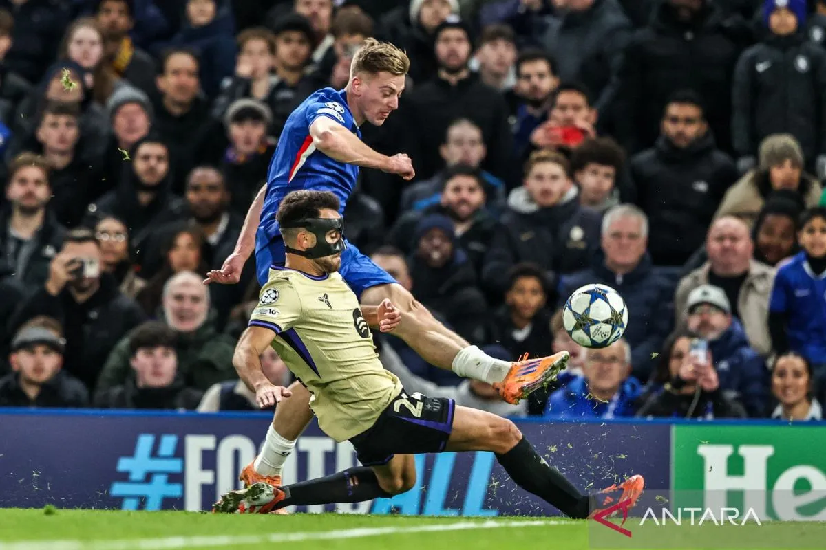 Pesepak bola Chelsea Liam Delap (atas) menendang bola ke arah gawang Barcelona dihadang pesepak bola Barcelona Eric Garcia dalam pertandingan kelima fase liga Liga Champions di Stadion Stamford Bridge, London, Selasa (25/11/2025) waktu setempat. Dalam laga itu The Blues menang 4-0 atas Barcelona yang hanya bermain dengan 10 pemainnya. ANTARA FOTO/Reuters/News Images/Alfie Cosgrove/sgd