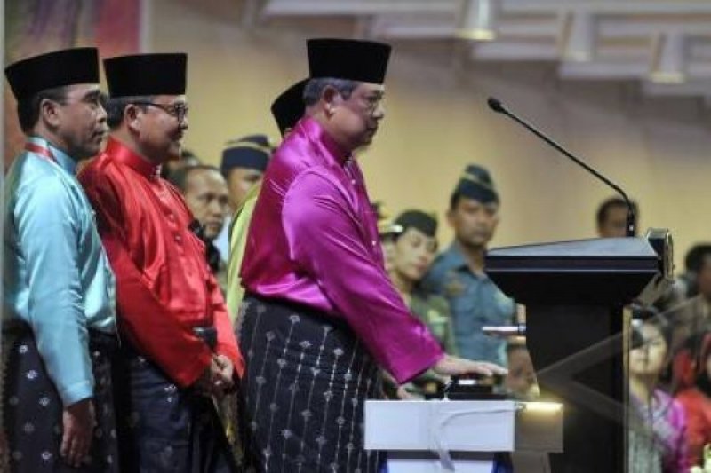 Presiden Susilo Bambang Yudhoyono (kanan) didampingi Gubernur Riau Rusli Zaenal (tengah) dan Ketua KONI Tono Suratman (kiri) membuka PON XVIII 2012 di stadion utama Riau, Selasa(11/9/12). (FOTO ANTARA/Prasetyo Utomo).