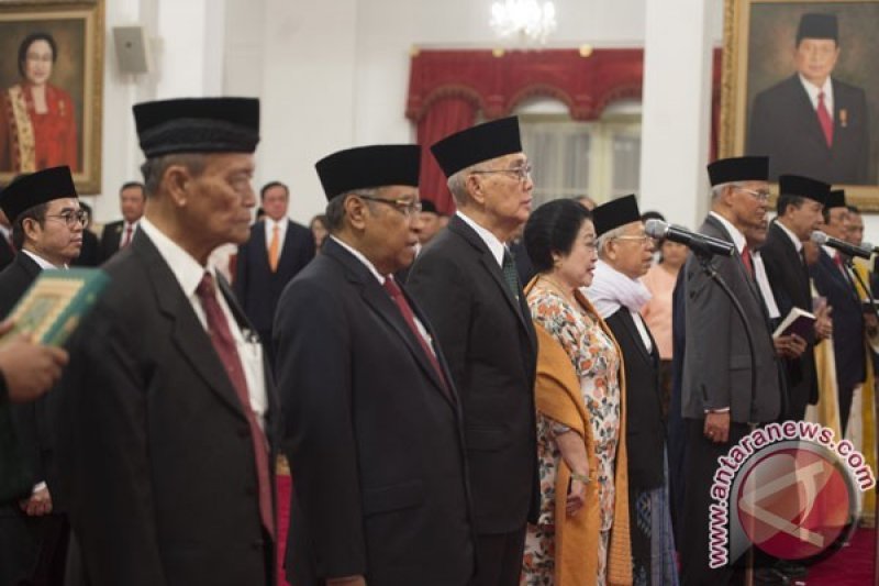 Kepala Dewan Pengarah dan Kepala Unit Kerja Presiden bidang Pembinaan Ideologi Pancasila (UKP-PIP) Yudi Latif (kiri belakang) bersama sembilan anggota melakukan sumpah dalam pelantikan UKP-PIP di Istana Negara, Jakarta, Rabu (7/6/2017). Sembilan anggota dari UKP-PIP tersebut yaitu Mayjen (Purn) Wisnu Bawa Tenaya, Said Aqil Siradj, Try Sutrisno, Ma'ruf Amin, Megawati Soekarnoputri, mantan Ketua MK Mahfud MD, Andreas Anangguru Yewangoe, Sudhamek, dan mantan Ketua Umum PP Muhammadiyah Syafii Maarif .