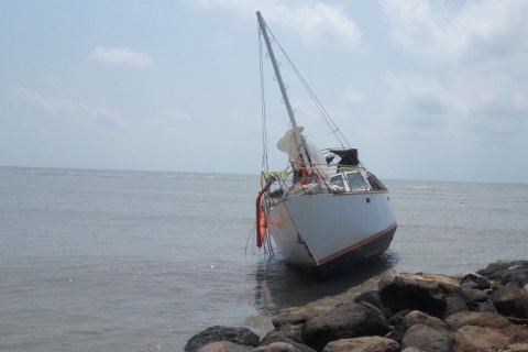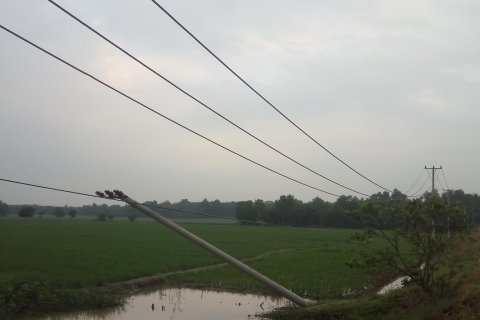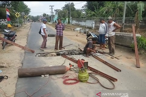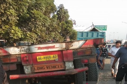 Diduga lupa gunakan rem, truk panjang tabrak warung dan meluncur ke siring