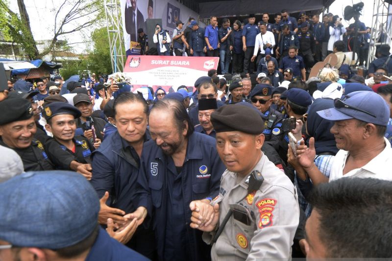 Anggota Polisi melakukan pengamanan terhadap Ketua Umum Partai Nasdem Surya Paloh saat Rapat Umum Partai Nasdem bertemakan Anies Presiden Nasdem Juara di Lapangan Baruna, Panjang, Bandar Lampung, Lampung, Senin (29/1/2023). Polda Lampung mengerahkan 8.568 personel untuk mengamankan pelaksanaan Pemilihan umum 2024. ANTARA FOTO/Ardiansyah.